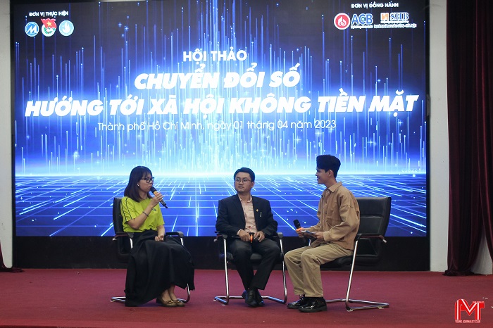 Trong khuôn khổ Ngày hội, các bạn sinh viên được tham gia Hội thảo với chủ đề “Chuyển đổi số hướng tới xã hội không tiền mặt” và Phiên chợ Không tiền mặt. Tại đây bạn được nghe các anh chị là chuyên gia trong lĩnh vực Ngân hàng chia sẻ về những tiện ích của việc thanh toán không dùng tiền mặt mang lại, xu thế tất yếu của một xã hội không tiền mặt, những sản phẩm hiện nay và mức độ an toàn bảo mật của nó mang lại.