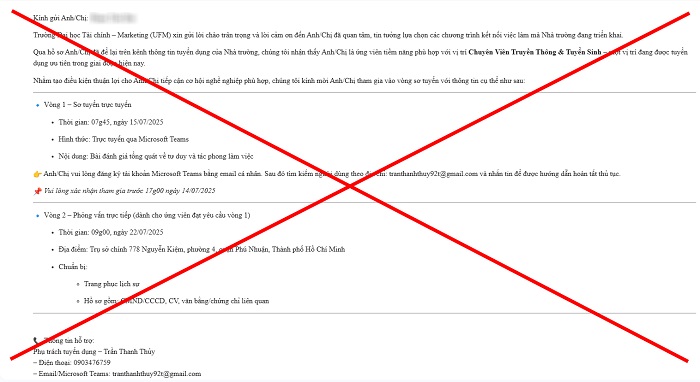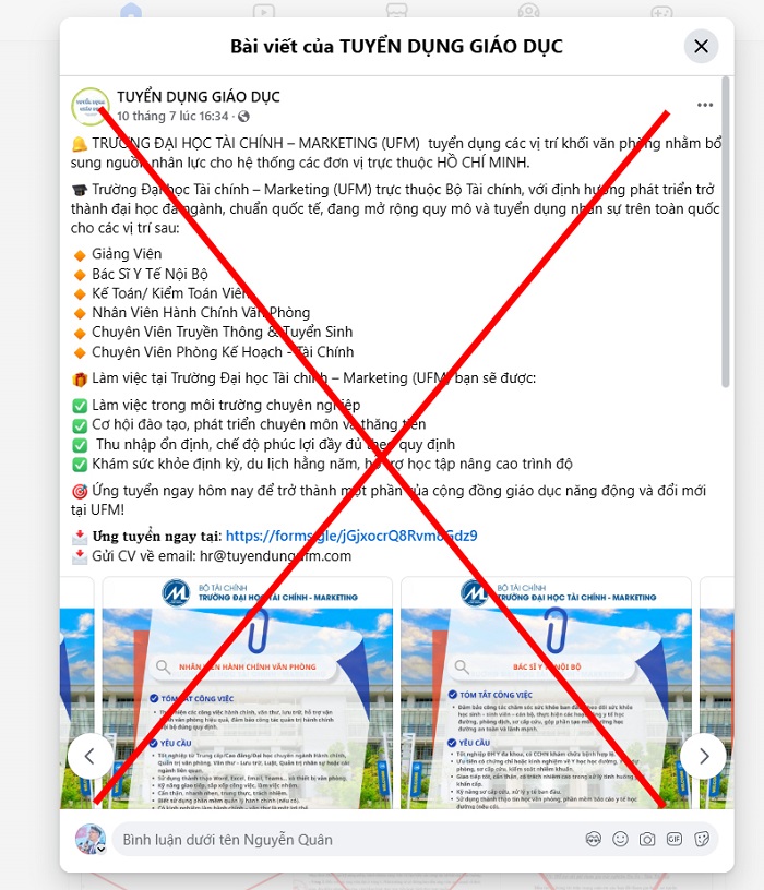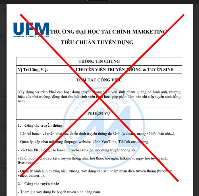 Trường Đại học Tài chính – Marketing (UFM) vừa phát đi cảnh báo về việc xuất hiện các đối tượng giả danh cán bộ Nhà trường để thực hiện hành vi lừa đảo thông qua hình thức đăng tải thông tin tuyển dụng các vị trí: giảng viên, bác sĩ Y tế nội bộ, Chuyên viên Truyền thông – Tuyển sinh…