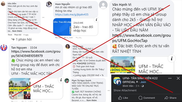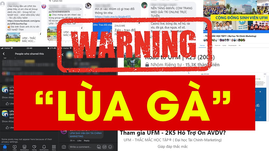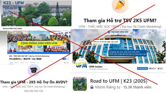 Một số group mạo danh, gắn với các từ khoá "UFM", "K23"... có tình trạng các admin thu thập các thông tin cá nhân nhằm các mục đích không rõ ràng. Hoặc những người này đóng vai sinh viên khóa trên, đăng lên diễn đàn lời giới thiệu, như “Em có câu hỏi gì thắc mắc thì inbox riêng anh, chị hoặc kết bạn Facebook để anh, chị add vào group chat của khoa trường”.