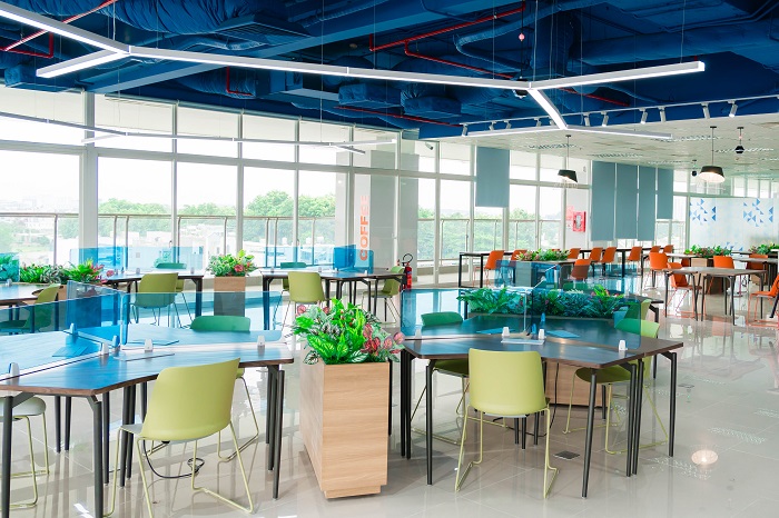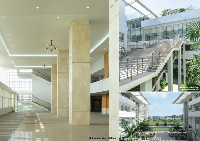 Không gian học tập không chỉ giới hạn trong phòng học. Các sảnh giải lao, hành lang mở, sân trong, góc tiểu cảnh được thiết kế thoáng đãng, tràn ngập ánh sáng và cây xanh, tạo nên những khu vực sinh hoạt chung, giao lưu, học nhóm lý tưởng, kích thích sự sáng tạo và mang lại cảm giác thoải mái cho sinh viên sau những giờ học.