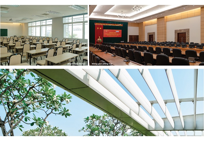 • Khối Hành chính - Giảng đường - Hội trường - Thư viện: Trung tâm đầu não với các phòng chức năng, phòng học đa dạng (quy mô 120 - 200 chỗ ngồi), hội trường lớn, thư viện trung tâm kết hợp cả không gian đọc truyền thống và khu vực thư viện điện tử hiện đại.