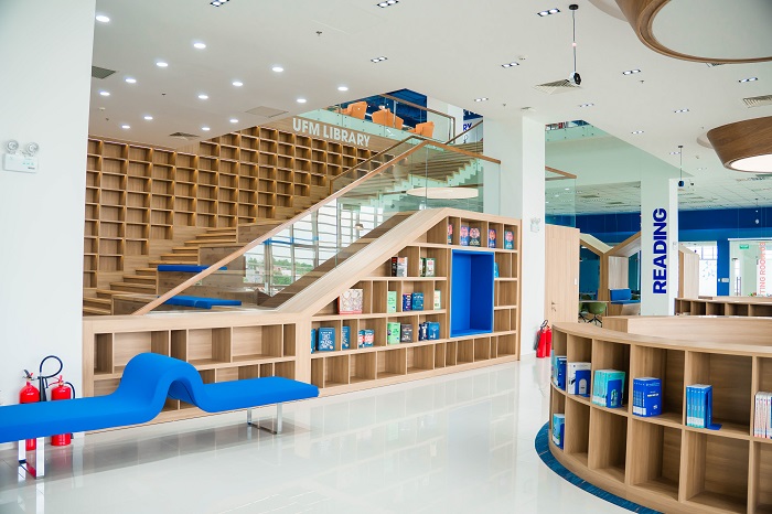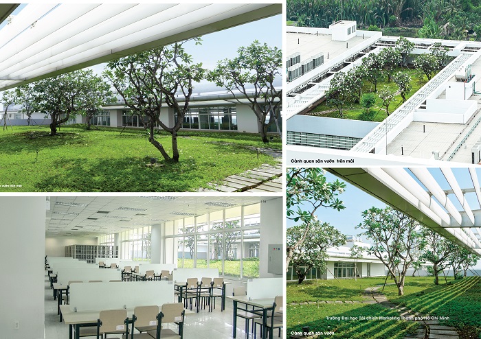 Khác biệt hoàn toàn với lối kiến trúc trường học truyền thống, cơ sở Long Trường của UFM là một bản giao hưởng giữa bê tông, thép, kính và thiên nhiên. Điểm nhấn kiến trúc độc đáo và xuyên suốt chính là triết lý thiết kế xanh, ưu tiên thông gió và chiếu sáng tự nhiên, thích ứng hiệu quả với khí hậu nhiệt đới. Bao quanh các khối giảng đường là hệ thống "lớp vỏ lam" chắn nắng được thiết kế thành những mảng lớn, vừa tạo hiệu quả che chắn tối ưu, giảm thiểu bức xạ nhiệt trực tiếp, vừa đảm bảo ánh sáng tự nhiên chan hòa và luồng không khí đối lưu len lỏi vào từng phòng học.
