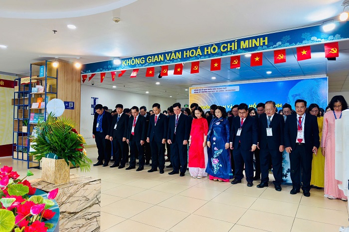 Các đồng chí lãnh đạo và đại biểu dâng hoa trước tượng đài chủ tịch Hồ Chí Minh tại Không gian văn hóa Hồ Chí Minh
