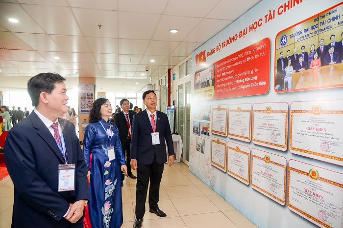 Các đại biểu tham quan triển lãm ảnh: “Dưới ánh sáng Đảng soi đường – Rạng ngời bản sắc UFM” – Những dấu ấn nổi bật của Đảng bộ Trường Đại học Tài chính – Marketing trong nhiệm kỳ 2020 – 2025