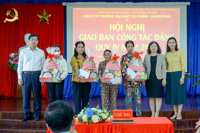 Cũng tại Hội nghị, nhân dịp Tết Ất Tỵ 2025 sắp đến và thể hiện tinh thần cao đẹp “lá lành đùm lá rách”, Đảng ủy Trường Đại học Tài chính – Marketing cũng trao gửi 5 phần quà nghĩa tình tới 5 gia đình chính sách có hoàn cảnh khó khăn trên địa bàn phường Mỹ Bình, thành phố Long Xuyên, tỉnh An Giang. Mỗi phần quà trị giá 2,5 triệu đồng.