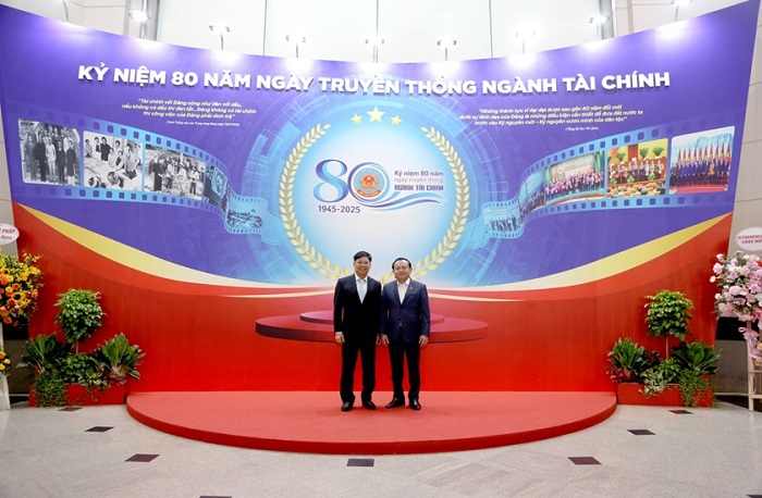 PGS. TS. Phạm Tiến Đạt chụp ảnh lưu niệm cùng Thứ trưởng Bộ Tài chính Lê Tấn Cận