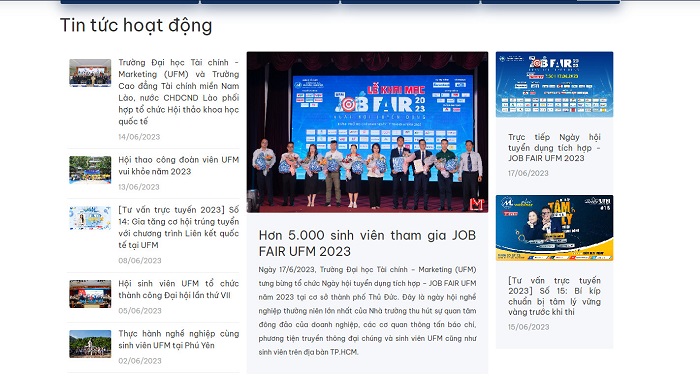 Trong thời gian qua, các tin tức về các hoạt động của Trường được cập nhật liên tục trên website https://ufm.edu.vn. Các tin bài được xây dựng đa dạng về hình thức, đặc sắc trong nội dung, thu hút được sự quan tâm của người giảng viên, viên chức và người học. Các sự kiện chính trị lớn của Nhà trường; các hoạt động trọng điểm của lãnh đạo Trường; các ý kiến phản ánh, các góc nhìn đa chiều của giảng viên, sinh viên…là những vấn đề đã được đầu tư khai thác trong thời gian qua. Quy trình biên tập, viết tin, đưa tin được thực hiện một cách kín kẽ, đảm bảo thông tin chính xác nhất, thú vị nhất.