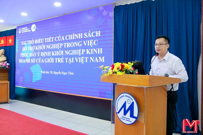 Tiếp theo là phần tham luận “Vai trò điều tiết của chính sách hỗ trợ khởi nghiệp trong việc thúc đẩy ý định khởi nghiệp kinh doanh số của giới trẻ tại Việt Nam” của nhóm tác giả TS. Nguyễn Ngọc Thức, IUH. Nhóm nghiên cứu trình bày mô hình gồm 8 yếu tố: giáo dục khởi nghiệp số, môi trường kinh doanh, phương tiện truyền thông xã hội, kỳ vọng kết quả, thái độ khởi nghiệp, kiến thức khởi nghiệp số, chính sách hỗ trợ khởi nghiệp và ý định khởi nghiệp có tác động tích cực đến ý định khởi nghiệp số của giới trẻ tại Việt Nam. Đặc biệt là xem xét vai trò điều tiết của chính sách hỗ trợ, từ đó đề xuất hàm ý quản trị và khuyến nghị nhằm phát huy các yếu tố ảnh hưởng mạnh, đồng thời hoàn thiện chính sách hỗ trợ để thúc đẩy khởi nghiệp số của giới trẻ Việt Nam.