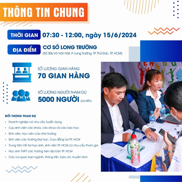 Theo đó, JOB FAIR UFM 2024 sẽ được tổ chức vào ngày 15/6/2024 tại Cơ sở 306 Võ Văn Hát, Phường Long Trường, TP. Thủ Đức, TP.HCM với hơn 100 gian hàng tuyển dụng cùng hàng nghìn vị trí việc làm và gần 5000 sinh viên tham gia ứng tuyển.
