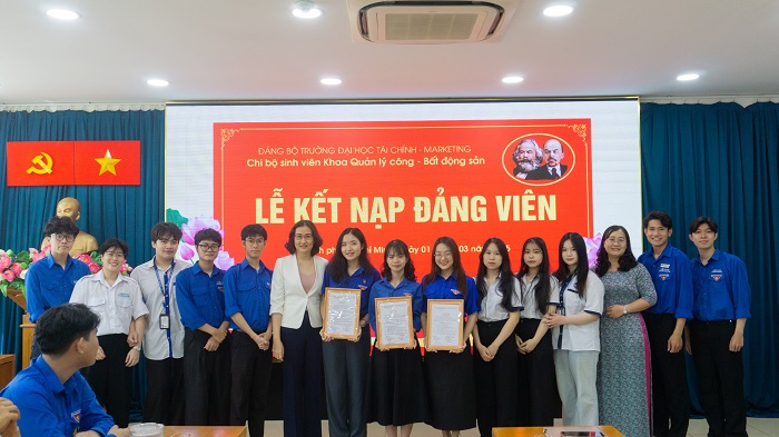 Được sự đồng ý của Đảng ủy, ngay sau Lễ khởi động Tháng Thanh niên 2025 Chi bộ Sinh viên Khoa Quản lý công - Bất động sản đã long trọng tổ chức Lễ kết nạp Đảng viên mới cho 3 Đoàn viên ưu tú đứng vào hàng ngũ của đảng bao gồm: Đ/c Trương Lê Quỳnh Nga - Ủy viên Ban Thường vụ Đoàn Khoa Quản lý công - Bất động sản; Đ/c Phùng Ngọc Bình – Đoàn viên Chi Đoàn 21DTD; Đ/c Bùi Thị Thúy An – Đoàn viên Chi Đoàn 22DHQ02.