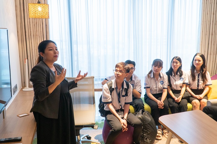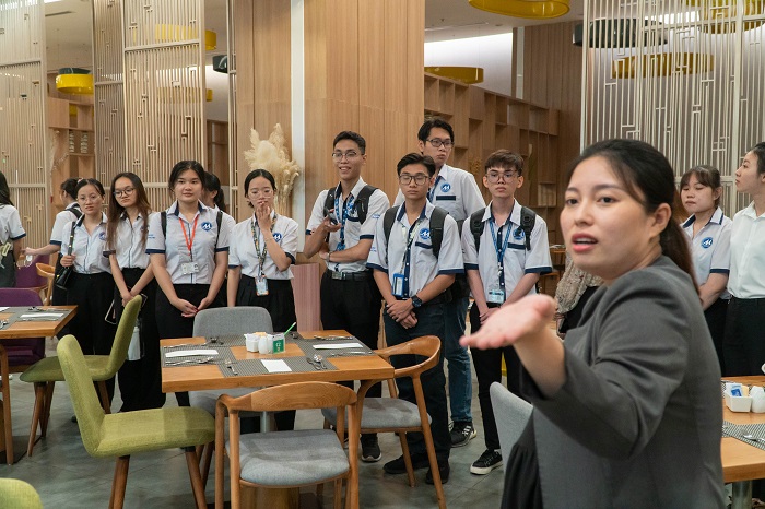 Đặc biệt, sau thành công của lễ ký kết, các bạn sinh viên được tham quan học tập ngay tại khách sạn. Tại đây, các bạn được chứng kiến sự chỉnh chu, chuyên nghiệp trong các công tác chào đón và phục vụ khách hàng từ các bộ phận bắt đầu là bộ phận Lễ tân. Các bạn sinh viên còn được các anh chị phụ trách các bộ phận như buồng phòng, bộ phận quản lý bếp, các bộ phận dịch vụ trong khách sạn để từ đó sinh viên cảm nhận độ chuyên nghiệp từ phòng ngủ đến bàn ăn hay các dịch vụ đa dạng trong khách sạn như hồ bơi, phòng gym… đều được khách sạn chăm chút, mong muốn mang đến cho khách hàng những trải nghiệm tốt nhất. Các bạn đã được lắng nghe, trao đổi trực tiếp cùng đại diện bộ phận nhân sự về nhiều vấn đề như: Môi trường làm việc, hoạt động kinh doanh, quy trình vận hành, các nghiệp vụ cần thiết của các bộ phận. Chính những chia sẻ của anh chị đại diện sẽ giúp sinh viên có cái nhìn cận cảnh hơn về ngành nghề mà mình theo đuổi và xác định hướng đi rõ ràng cho công việc sau này.