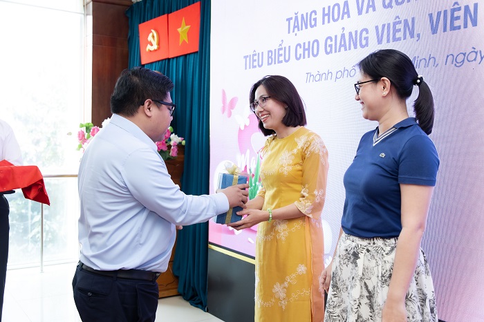TS. Cao Tấn Huy, Phó Bí thư Đảng ủy, Phó Hiệu trưởng, Chủ tịch Công đoàn trường trao tặng quà cho các nữ tiến sĩ của Trường