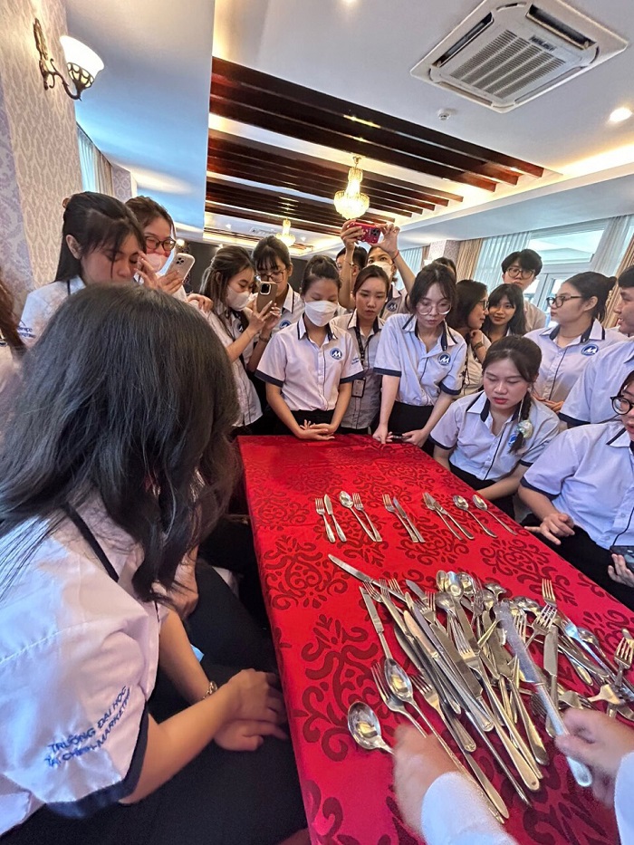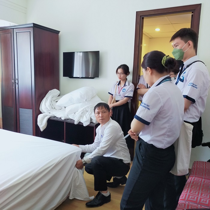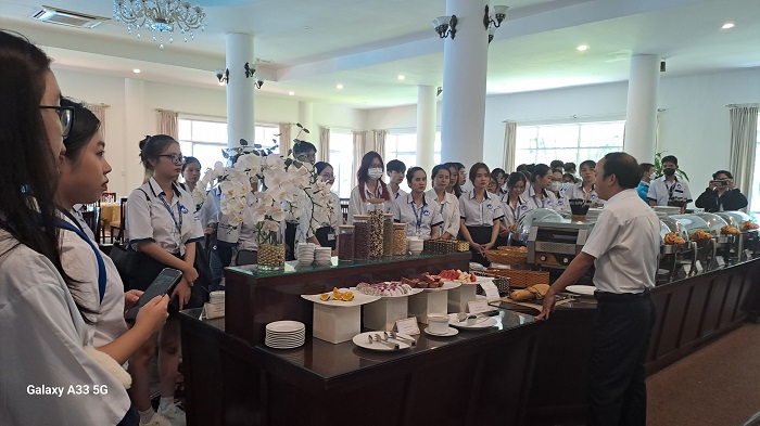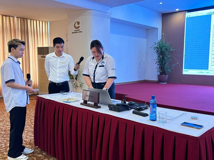 Tại khách sạn Century Riverside và Montial Hotel, sinh viên đã được học những kĩ năng về nghiệp vụ như thực hành ở vị trí như một lễ tân khách sạn chuyên nghiệp, tìm hiểu chi tiết về quy trình phục vụ và quản lí tại nhà hàng, thực hành tại bộ phần buồng phòng, bộ phận kinh doanh, bộ phận nhân sự… Nội dung được xây dựng trên cơ sở kiến thức chuyên môn và triển khai theo chuyên đề thực hành gắn liền thực tế giúp sinh viên dễ dàng nắm bắt, vận dụng được những kiến thức đã được học tại giảng đường vào nghề nghiệp, bồi dưỡng tác phong chuyên nghiệp trong ngành nghề phục vụ. Các anh chị đại diện bộ phận F&B, Housekeeping, Sales & Marketing… nhiệt tình chỉ dẫn về quy trình hoạt động của khách sạn và hỗ trợ giải đáp thắc mắc cho sinh viên trong suốt quá trình học tập.