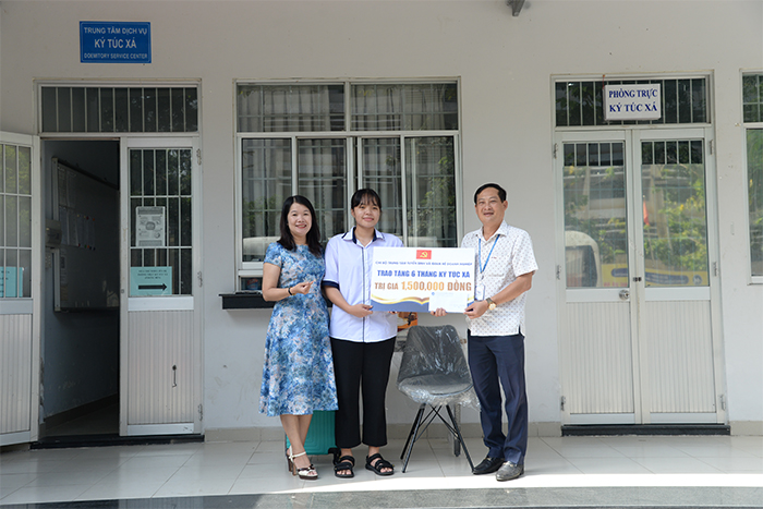 Với mong muốn động viên và san sẻ phần nào khó khăn, Nhà trường và quý doanh nghiệp đã trực tiếp trao tặng suất tài trợ đến với em Lan. Hy vọng phần quà nhỏ này sẽ là một nguồn lực mới để em có thể tiếp tục nổ lực trong học tập, không phụ sự kỳ vọng của thầy cô, ba mẹ và những người đã giúp đỡ mình.