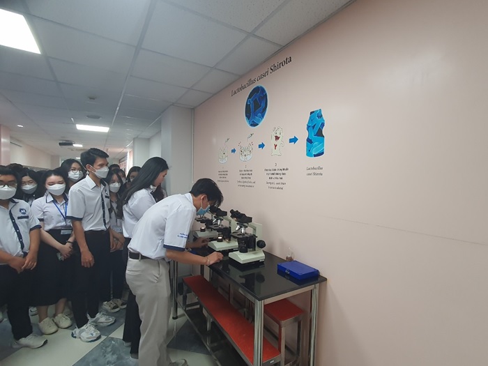 Các bạn sinh viên đều cảm thấy rất hứng thú khi được trực tiếp quan sát khuẩn L.casei Shirota, để hiểu hơn về thức uống vô cùng có lợi cho đường ruột mà các bạn hay được thưởng thức.