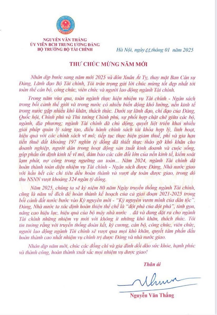 Nhân dịp bước sang năm mới 2025 và đón Xuân Ất Tỵ, Bộ trưởng Bộ Tài chính Nguyễn Văn Thắng có bức thư chúc mừng gửi tới toàn thể cán bộ, công chức, viên chức và người lao động ngành Tài chính.