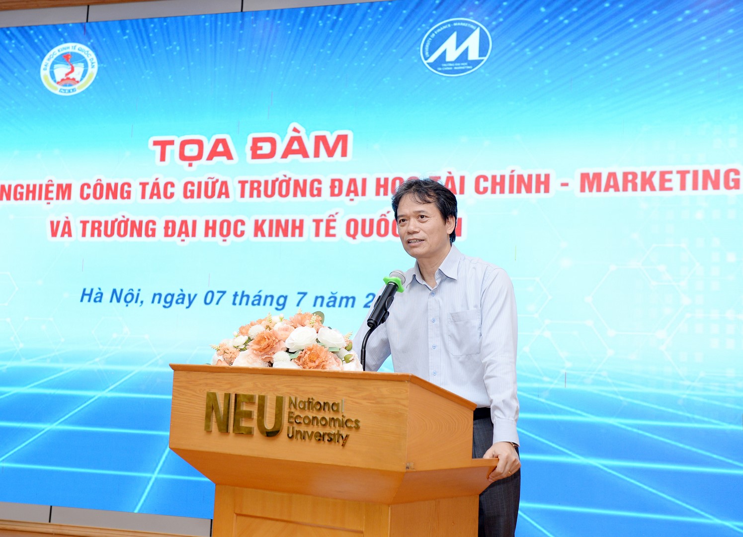 Phát biểu tại buổi làm việc, TS. Nguyễn Văn Hiến - Phó Hiệu trưởng UFM cho biết, Trường Đại học Tài chính - Marketing là cơ sở giáo dục đại học trực thuộc Bộ Tài chính, có nhiệm vụ đào tạo, phát triển các lĩnh vực chuyên môn liên quan đến lĩnh vực tài chính - ngân hàng, marketing, quản trị kinh doanh, kế toán, … TS. Nguyễn Văn Hiến nhấn mạnh, trong quá trình phát triển, UFM luôn chú trọng đẩy mạnh hợp tác với các trường đại học trong nước và quốc tế, với các doanh nghiệp và xác định đó là một trong những nhiệm vụ quan trọng trong chiến lược phát triển của Nhà trường. NEU là một trong những trường đại học đầu ngành khối các trường đại học đào tạo về kinh tế, kinh doanh và quản lý ở Việt Nam. UFM hy vọng thông qua buổi tọa đàm, hai trường sẽ có những chia sẻ về chuyên môn, trao đổi kinh nghiệm và đi vào những hoạt động hợp tác thực chất, góp phần nâng cao chất lượng đào tạo, NCKH vả phục vụ cộng đồng.