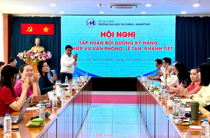 Sáng ngày 21/12/2025, tại cơ sở 27 Tân Mỹ, Trường Đại học Tài chính – Marketing (UFM) đã tổ chức thành công Hội nghị tập huấn bồi dưỡng kỹ năng, nghiệp vụ văn phòng, lễ tân và khánh tiết. Với sự hướng dẫn trực tiếp của các chuyên gia giàu kinh nghiệm thực tiễn, hội nghị là bước đi chiến lược trong lộ trình chuyên nghiệp hóa đội ngũ và hiện đại hóa quy trình hành chính của Nhà trường.