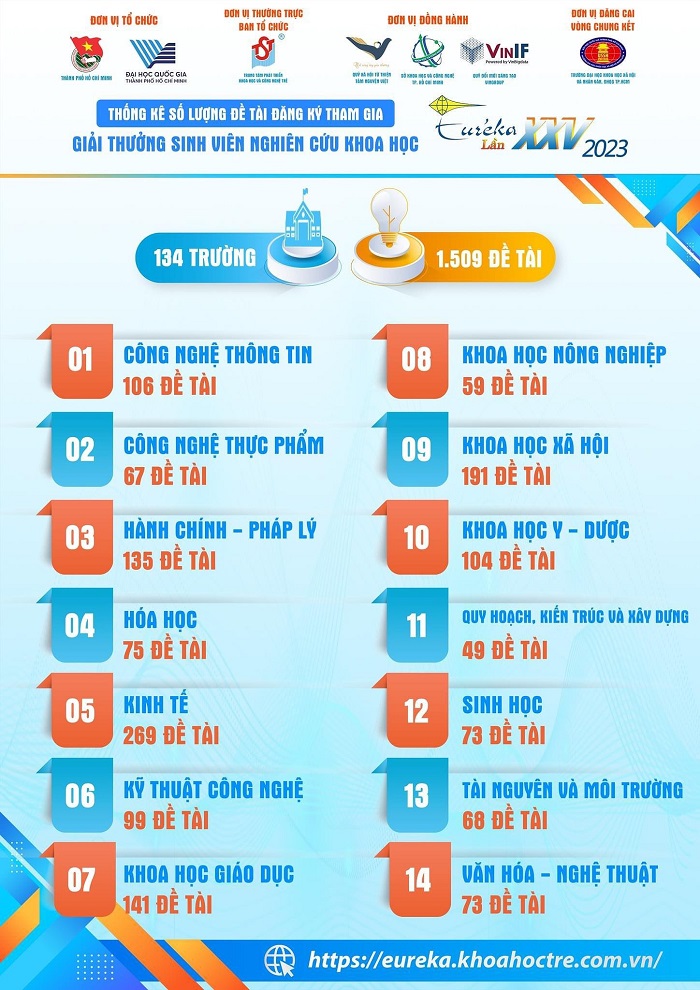 Giải thưởng Euréka năm nay thu hút 1.509 đề tài đến từ 134 trường đại học, cao đẳng, học viện trên cả nước với 14 lĩnh vực: công nghệ thông tin (106 đề tài), công nghệ thực phẩm (67 đề tài), hành chính – pháp lý (135 đề tài), hóa học (75 đề tài), kinh tế (269 đề tài), kỹ thuật công nghệ (99 đề tài), khoa học giáo dục (141 đề tài), khoa học nông nghiệp (59 đề tài), khoa học xã hội (191 đề tài), khoa học y – dược (104 đề tài), quy hoạch, kiến trúc và xây dựng (49 đề tài), sinh học (73 đề tài), tài nguyên và môi trường (68 đề tài), văn hóa – nghệ thuật (73 đề tài).