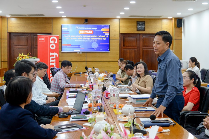 Phát biểu tại Hội thảo, PGS.TS Phạm Tiến Đạt nhấn mạnh, Nhà trường đang triển khai rà soát tổng thể các chương trình đào tạo, và hướng tới làm sao đạt được sự công nhận tín chỉ các môn học. Hiện nay tốc độ về chuyển đổi số làm cho các môn học có xu hướng thay đổi nhanh làm cho người học cảm thấy liệu rằng có thể thích nghi với thị trường lao động, với sự thay đổi đó không. Với góc độ đó, ngoài vấn đề phối hợp, quan tâm tới chương trình đào tạo trên thế giới chúng tôi nhận thấy rằng các hiệp hội nghề nghiệp có uy tín trên thế giới thường xuyên làm việc với các doanh nghiệp, với thị trường lao động cũng thích ứng được với sự thay đổi của hoạt động kinh tế-xã hội; do vậy để đáp ứng nhu cầu từ nhiều phía, kể cả từ sinh viên, chúng tôi cũng mong muốn trên cơ sở các đơn vị đã có kinh nghiệm tích hợp một số môn học để mang lại sự thuận tiện nhất cho sinh viên, vừa nâng cao chất lượng đào tạo nhà trường vừa đáp ứng quyền lợi của sinh viên, thì việc tích hợp các môn trong chứng chỉ nghề nghiệp quốc tế vào trong CTĐT là hết sức quan trọng.