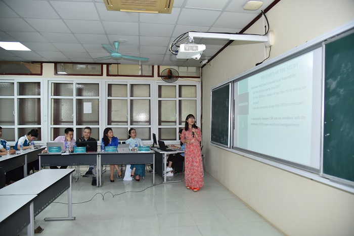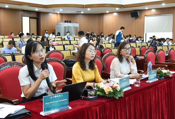 PGS.TS Phan Thị Hằng Nga, Trưởng phòng Quản lý khoa học tham gia đoàn chủ tọa phiên thảo luận chuyên sâu và ThS. Thái Trần Vân Hạnh, Phó Trưởng khoa Kế toán – Kiểm toán trình bày tham luận tại Hội thảo