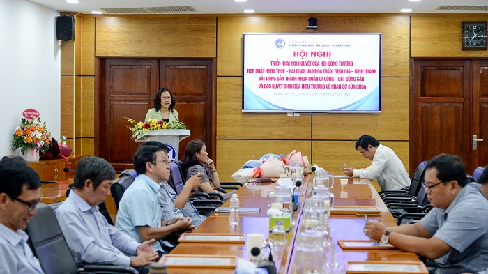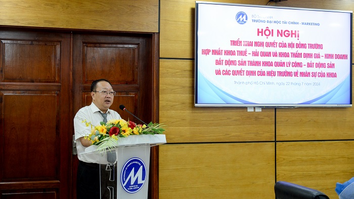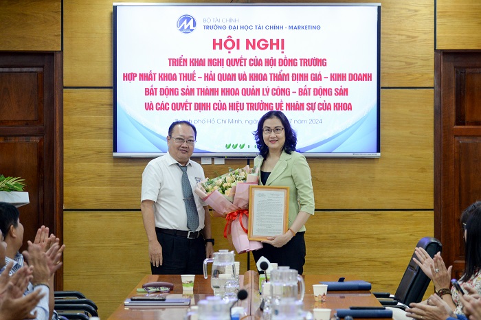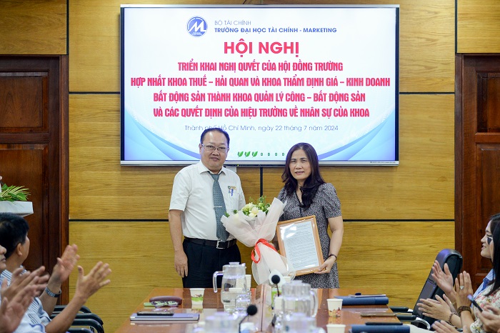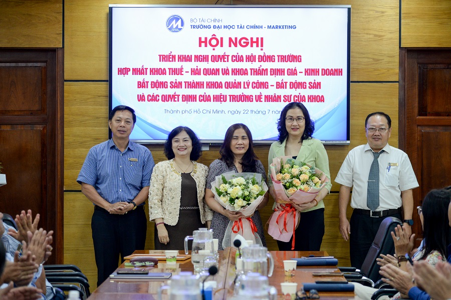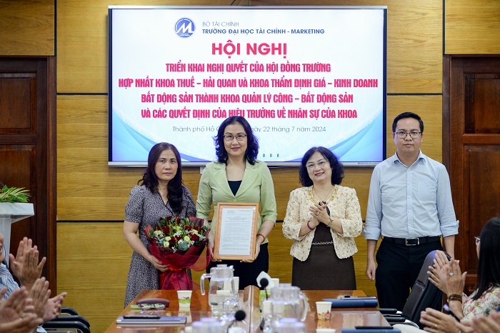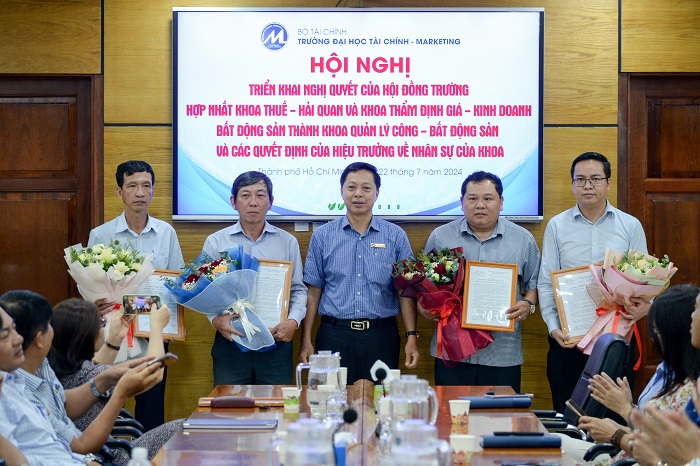 Sáng ngày 22/7/2024, Trường Đại học Tài chính – Marketing (UFM) đã tổ chức Hội nghị triển khai Nghị quyết của Hội đồng Trường về việc hợp nhất khoa Thuế - Hải quan và Khoa Thẩm định giá – Kinh doanh bất động sản thành khoa Quản lý công – Bất động sản và các quyết định của Hiệu trưởng về nhân sự.