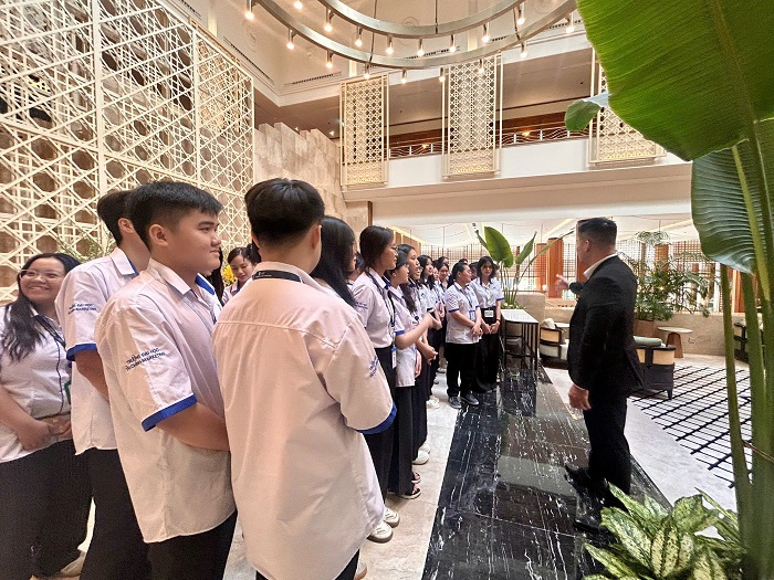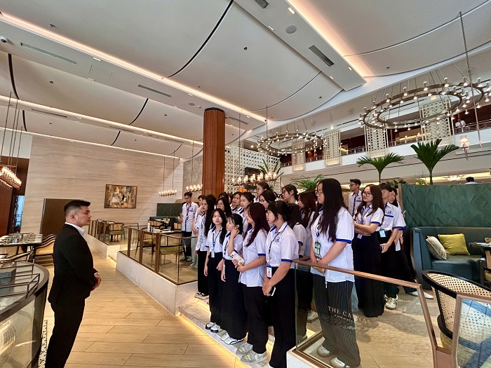 Tiếp nối chương trình, phần Hotel Tour mang đến góc nhìn trực quan về mô hình vận hành tại khách sạn. Sinh viên được giới thiệu tổng thể về quy trình dịch vụ và cách phối hợp liên bộ phận trong môi trường tiêu chuẩn cao. Việc quan sát trực tiếp không gian làm việc, tác phong phục vụ và một số điểm chạm quan trọng trong trải nghiệm khách hàng giúp người học kết nối kiến thức trên giảng đường với thực tiễn vận hành, qua đó hình thành tư duy nghề nghiệp rõ ràng hơn. Nhiều sinh viên cho biết hoạt động tham quan giúp các em nhận diện cụ thể các yêu cầu kỹ năng, chuẩn bị tốt hơn cho giai đoạn thực tập và định hướng vị trí nghề nghiệp phù hợp năng lực.