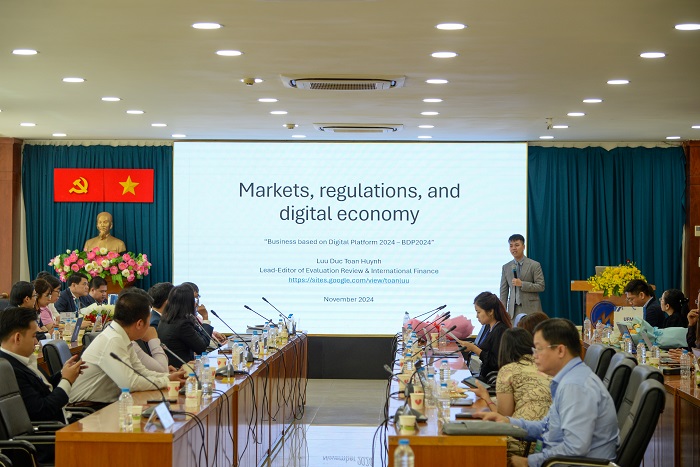 PGS.TS Huỳnh Lưu Đức Toàn, Trường Kinh doanh và Quản lý thuộc ĐH Queen Mary (Anh Quốc), trình bày chủ đề "Thị trường, quy định và nền kinh tế số" nói về các thách thức và chính sách liên quan đến các nền tảng kinh doanh số. Theo ông, các doanh nghiệp nền tảng đối mặt với nhiều thách thức từ đối thủ cạnh tranh, đối tác bổ sung, nhân viên và chính quyền. Chính sách cạnh tranh buộc các công ty phải đổi mới, khác biệt hóa và sản xuất hiệu quả, trong khi chính sách độc quyền cho phép các công ty kiếm lợi nhuận cao nhưng gây tổn thất cho người tiêu dùng và xã hội. Các vấn đề thuế và tác động của số hóa đến thị trường lao động hợp đồng, rủi ro của tiền điện tử trong các khoản đầu tư năng lượng và thị trường tài chính... cũng được đề cập.
