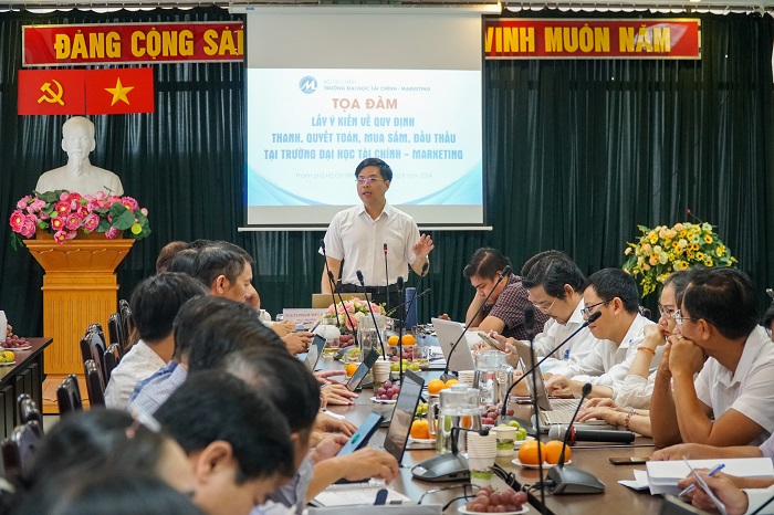 Sáng ngày 14 tháng 8 năm 2024, tại Trụ sở 778 Nguyễn Kiệm, Phường 4, Quận Phú Nhuận, TP. Hồ Chí Minh, Ban Giám hiệu nhà trường tổ chức buổi Tọa đàm lấy ý kiến đối với dự thảo Quy trình thanh toán, mua sắm, đấu thầu tại Trường Đại học Tài chính - Marketing.