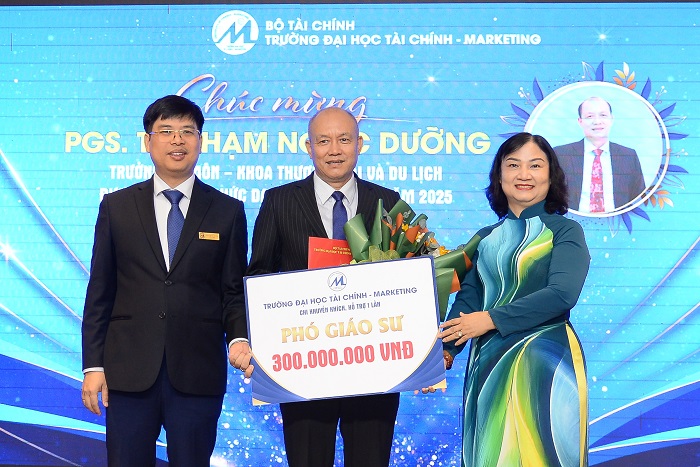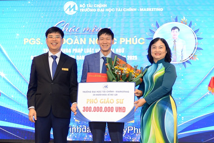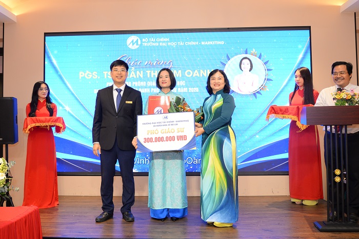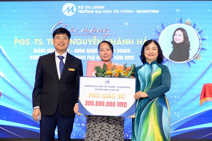 Nhân dịp này, Trường Đại học Tài chính – Marketing đã trao tặng mức thưởng 300 triệu đồng cho các tân Phó Giáo sư được công nhận đạt chuẩn chức danh Phó Giáo sư ngành Kinh tế. Đây là sự ghi nhận xứng đáng của Nhà trường đối với những nỗ lực bền bỉ, nghiêm túc và thành tích học thuật nổi bật của các thầy cô, đồng thời thể hiện sự quan tâm, đầu tư chiến lược của UFM trong việc xây dựng và phát triển đội ngũ giảng viên, nhà khoa học chất lượng cao.