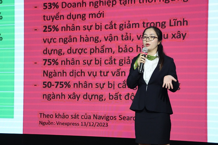 Tiếp theo phần chia sẻ về cơ hội và thách thức nghề nghiệp trong thời kì chuyển đổi số, các diễn giả đã chia sẻ về kỹ năng tạo ấn tượng trong tuyển dụng. Kỹ năng tạo ấn tượng trong tuyển dụng là một yếu tố quan trọng giúp ứng viên ghi điểm với nhà tuyển dụng và tăng cơ hội trúng tuyển. Kỹ năng này thể hiện qua nhiều khía cạnh, bao gồm: Giới thiệu bản thân, cách trả lời câu hỏi, ứng xử trong buổi phỏng vấn. Để có thể thành công trong buổi phỏng vấn, ứng viên cần trang bị trước cho mình những kỹ năng: sự tự tin, kỹ năng giao tiếp và sự chuẩn bị kĩ lưỡng đặc biệt là tìm hiểu môi trường văn hóa tại các doanh nghiệp. Tại đây, các bạn sinh viên UFM còn có cơ hội đặt câu hỏi, giao lưu cùng các diễn giả. Đây là một cơ hội quý giá để các bạn sinh viên có thể được giải đáp những thắc mắc của mình và học hỏi thêm kinh nghiệm từ các chuyên gia. Các bạn sinh viên UFM đã đặt rất nhiều câu hỏi đa dạng, từ những câu hỏi về cơ hội nghề nghiệp trong thời kì chuyển đổi số, kỹ năng tạo ấn tượng trong tuyển dụng, đến những câu hỏi về kinh nghiệm cá nhân của các diễn giả. Các diễn giả không chỉ rất nhiệt tình trả lời câu hỏi mà còn chia sẻ thêm những kinh nghiệm thực tế của bản thân.