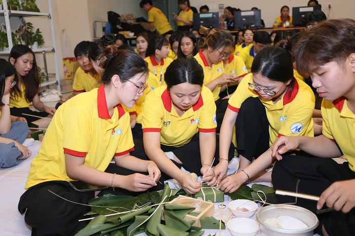 Các bạn sinh viên hào hứng tham gia Hội Xuân UFM và trải nghiệm gói bánh chưng