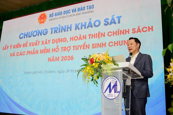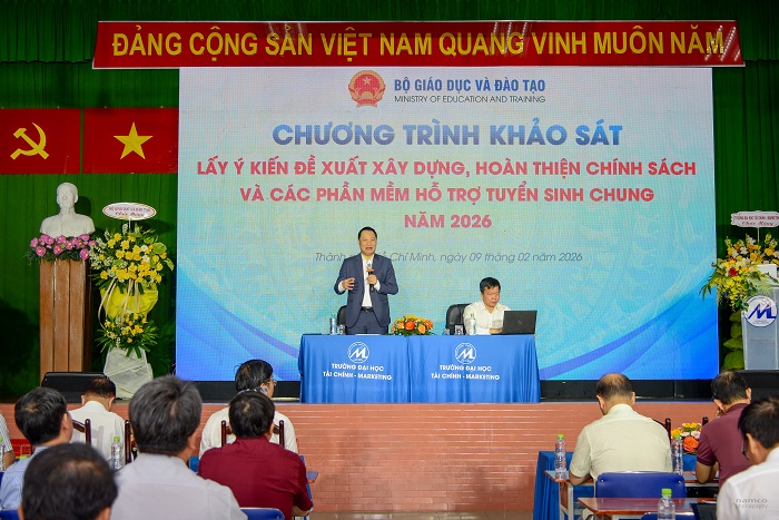 Ngày 09/02/2026, tại Trường Đại học Tài chính – Marketing, Bộ Giáo dục và Đào tạo đã tổ chức Hội nghị khảo sát, lấy ý kiến góp ý đối với các dự thảo chính sách và quy chế tuyển sinh đại học năm 2026. Hội nghị là hoạt động quan trọng nhằm lắng nghe ý kiến từ các cơ sở đào tạo, chuyên gia, qua đó hoàn thiện chính sách tuyển sinh theo hướng khoa học, thực tiễn và khả thi.