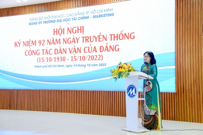 Ngày 14/10/2022, dưới sự chỉ đạo của Đảng bộ Khối Đại học, Cao đẳng Tp.HCM; Đảng ủy Trường Đại học Tài chính – Marketing đã tổ chức Hội nghị kỷ niệm 92 năm Ngày truyền thống Công tác Dân Vận của Đảng (15/10/1930 – 15/10/2022). Tham dự Hội nghị có sự hiện diện của đồng chí Hồ Thủy Tiên, Bí thư Đảng ủy, Chủ tịch Hội đồng Trường; đồng chí Nguyễn Xuân Hiệp, Phó Bí thư Đảng ủy cùng các đồng chí trong Đảng ủy, Ban Giám hiệu, Chi ủy các chi bộ trực thuộc.