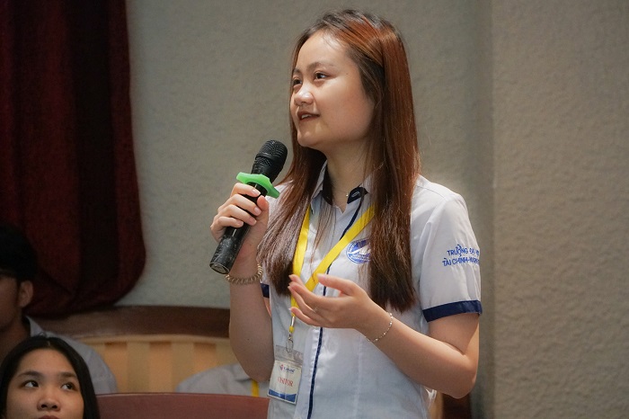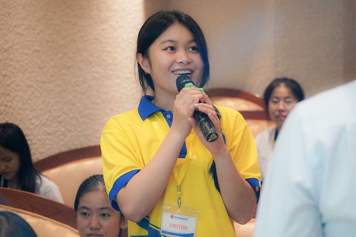 Song song đó, các bạn rất thích thú khi được chia sẻ về cách giải quyết các vấn đề, sự cố thường gặp trong tour để phục vụ cho ngành nghề tương lai. Ở phần giải đáp thắc mắc, các bạn đều phấn khích và đặt những câu hỏi liên quan đến doanh nghiệp và tiềm năng mà ngành du lịch hướng đến trong tương lai. Với sự nhiệt tình từ các bạn sinh viên, đại diện doanh nghiệp cũng không ngần ngại trả lời câu hỏi và đưa ra những câu trả lời đầy tính chuyên nghiệp cùng những bài học đắt giá mà họ đã tích lũy được. Anh Trần Thanh Tú – Hướng dẫn viên du lịch Vietravel, chia sẻ: “Chúng tôi mong muốn chia sẻ cho sinh viên những kiến thức thực tế nhất, giúp sinh viên tự tin hơn khi bước vào môi trường làm việc sau này.” Mong rằng qua buổi tham quan học tập thực tế này các bạn sinh viên sẽ vạch ra được rõ ràng hơn về lộ trình học tập hợp lí và trau dồi thêm những kỹ năng cần có cho nghề nghiệp tương lai.