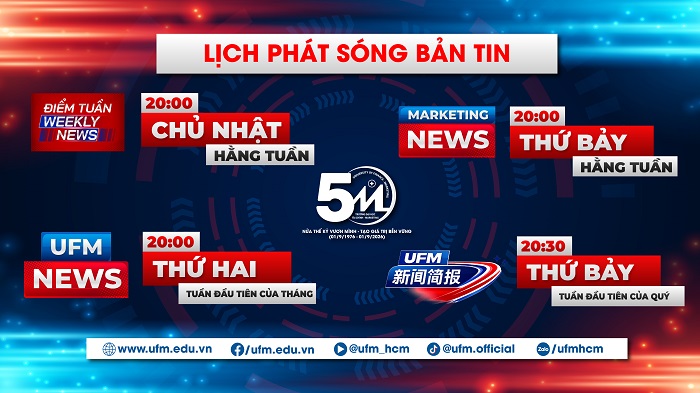 Bản tin tiếng Anh “UFM News” phát sóng vào 20g00 Thứ Hai của tuần đầu tiên mỗi tháng. Nội dung bản tin cập nhật các hoạt động đào tạo, nghiên cứu, phong trào Đoàn – Hội theo nhịp tháng, qua đó tăng cường kết nối, quảng bá hình ảnh Nhà trường đến bạn bè, đối tác quốc tế.