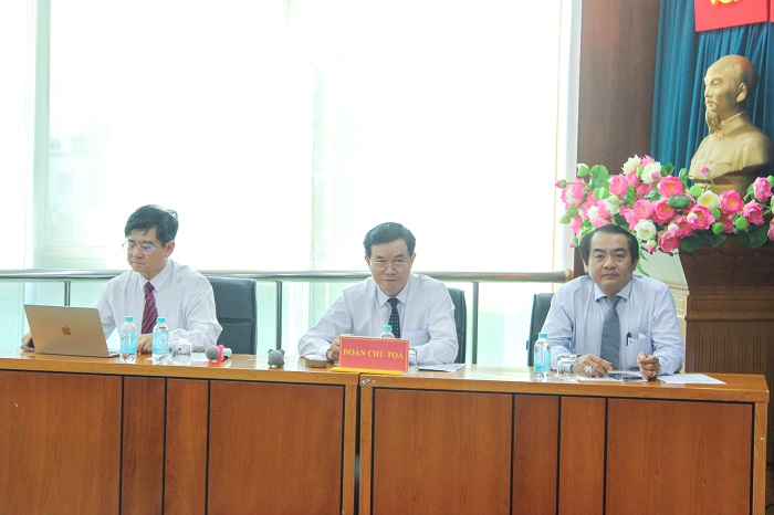 Đoàn chủ tọa gồm TS. Nguyễn Xuân Hiệp – Trưởng Khoa Thương mại và Du lịch; PGS.TS. Huỳnh Thế Nguyễn – Trưởng Khoa Quản trị kinh doanh; TS. Bảo Trung – Trưởng Khoa Marketing