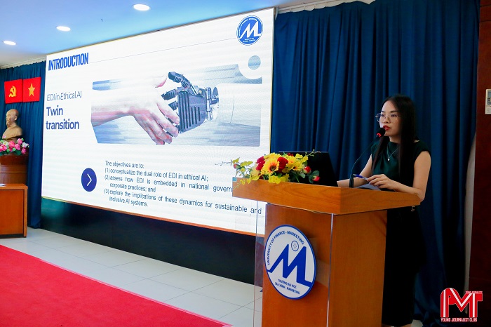 Tham luận “How EDI serves a dual role in ethical AI amid twin transition: A holistic study of developed countries” do tác giả ThS. Nguyễn Thị Diễm, UFM trình bày. Nghiên cứu sử dụng phân tích nội dung định tính và các nghiên cứu trường hợp so sánh tại EU, Canada và Hoa Kỳ. Phân tích nhấn mạnh cả những cơ hội và thách thức trong việc đo lường kết quả EDI, đồng thời kết luận rằng việc tích hợp EDI vào AI có đạo đức không chỉ là một yêu cầu mang tính chuẩn mực mà còn là điều kiện chiến lược để đạt được quá trình chuyển đổi số – xanh bền vững.