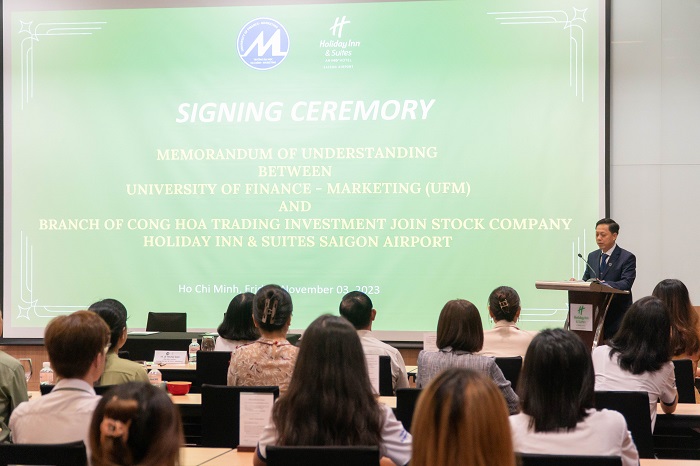 Trong đó, công tác hỗ trợ sinh viên tiếp cận với môi trường thực tế tại doanh nghiệp không ngừng được mở rộng. Với vai trò và tầm quan trọng của công tác hợp tác doanh nghiệp trong công tác đào tạo theo định hướng ứng dụng, hôm nay ngày 6/11/2023 Trường ĐH Tài chính - Marketing và Khách sạn Holiday Inn & Suites Saigon Airport ký kết hợp tác chiến lược nhằm mở ra cơ hội lớn cho sinh viên UFM, đặc biệt là sinh viên các ngành du lịch, khách sạn - nhà hàng trong việc học tập và thực hành nghề nghiệp trong môi trường có điều kiện phát triển năng lực nghề nghiệp tốt nhất làm tăng cơ hội có việc làm sau khi tốt nghiệp.