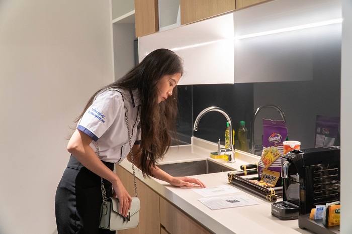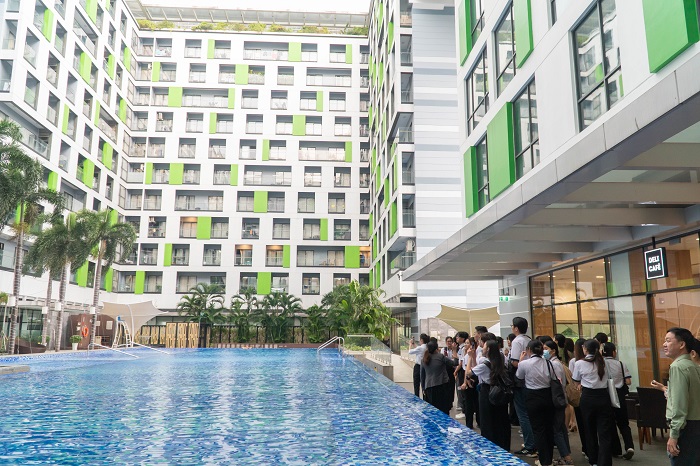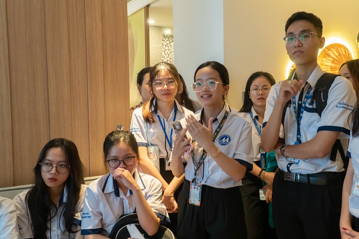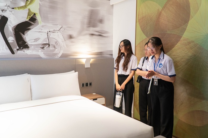 Đặc biệt, sau thành công của lễ ký kết, các bạn sinh viên được tham quan học tập ngay tại khách sạn. Tại đây, các bạn được chứng kiến sự chỉnh chu, chuyên nghiệp trong các công tác chào đón và phục vụ khách hàng từ các bộ phận bắt đầu là bộ phận Lễ tân. Các bạn sinh viên còn được các anh chị phụ trách các bộ phận như buồng phòng, bộ phận quản lý bếp, các bộ phận dịch vụ trong khách sạn để từ đó sinh viên cảm nhận độ chuyên nghiệp từ phòng ngủ đến bàn ăn hay các dịch vụ đa dạng trong khách sạn như hồ bơi, phòng gym… đều được khách sạn chăm chút, mong muốn mang đến cho khách hàng những trải nghiệm tốt nhất. Các bạn đã được lắng nghe, trao đổi trực tiếp cùng đại diện bộ phận nhân sự về nhiều vấn đề như: Môi trường làm việc, hoạt động kinh doanh, quy trình vận hành, các nghiệp vụ cần thiết của các bộ phận. Chính những chia sẻ của anh chị đại diện sẽ giúp sinh viên có cái nhìn cận cảnh hơn về ngành nghề mà mình theo đuổi và xác định hướng đi rõ ràng cho công việc sau này.