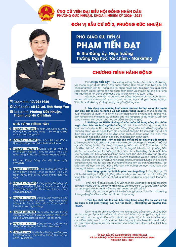 Trình bày chương trình hành động, PGS.TS Phạm Tiến Đạt bày tỏ mong muốn đóng góp vào sự phát triển của phường Đức Nhuận thông qua việc tiếp tục các chương trình kết nối nguồn lực tri thức từ Trường Đại học Tài chính – Marketing với nhu cầu thực tiễn của địa phương. Nếu được cử tri tín nhiệm, PGS.TS Phạm Tiến Đạt cam kết thúc đẩy nhiều hoạt động thiết thực như: hỗ trợ người dân nâng cao kỹ năng kinh doanh và quản lý tài chính, tổ chức các lớp tập huấn về kinh doanh nhỏ, thương mại điện tử, kỹ năng kê khai thuế và kế toán; đồng hành cùng chính quyền địa phương trong công tác chăm lo gia đình chính sách, người có công và các hoạt động an sinh xã hội.