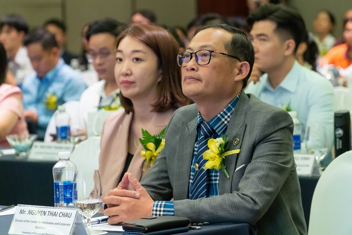 ThS. Nguyễn Thái Châu, Giám đốc Trung tâm Tuyển sinh và Quan hệ doanh nghiệp UFM đại diện các trường có sinh viên nhận học bổng phát biểu tại buổi lễ