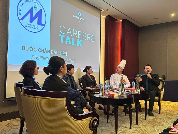 Tại chương trình, hơn 50 bạn sinh viên các ngành Quản trị khách sạn, Quản trị nhà hàng và dịch vụ ăn uống đã được lắng nghe các chia sẻ từ các diễn giả đại diện từ các bộ phận điều hành tại Khách sạn Lotte Sài Gòn như: Ms. Hằng Nguyễn – Giám đốc ẩm thực, Mr Phong Lê – Bếp phó điều hành, Ms. Thảo Huỳnh – Nhân viên hỗ trợ Khách hàng, Mrs. Do Võ – Quản lý cấp cao bộ phận Buồng phòng và cùng đồng hành với chương trình còn có ThS. Đặng Hữu Thoại – Giảng viên Khoa Thương mại – Du lịch Trường Đại học Tài chính – Marketing. Qua buổi giao lưu, các bạn sinh viên có cơ hội được tìm hiểu sâu hơn về kỹ năng nghề nghiệp, lộ trình thăng tiến, mối quan hệ tương quan lẫn nhau giữa các vị trí công việc trong lĩnh vực Khách sạn, Nhà hàng cũng như những kinh nghiệm thực tiễn quá trình công tác của các diễn giả. Đây là dịp để sinh viên hiểu rõ hơn về con đường phát triển sự nghiệp, những yêu cầu thực tế của ngành và xu hướng tuyển dụng hiện nay. Từ đó, sinh viên sẽ xây dựng kế hoạch cụ thể hơn cho bản thân để nâng cao năng lực, kỹ năng nhằm tăng lợi thế cạnh tranh khi bước vào thị trường lao động.