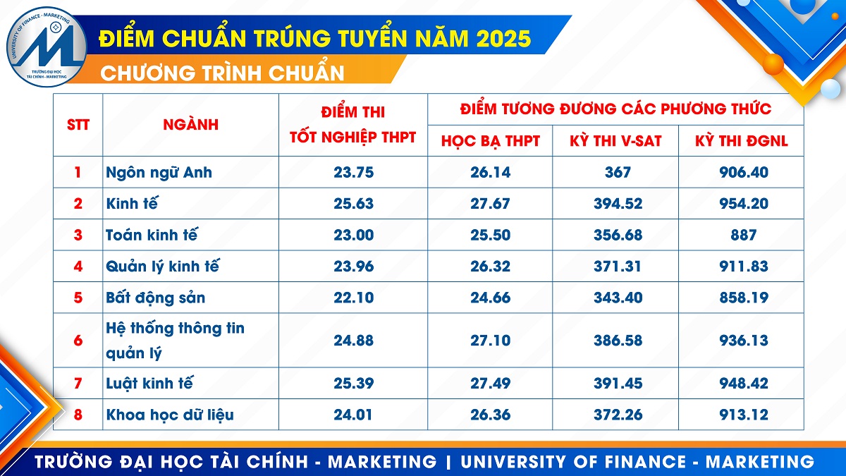 Theo đó, điểm chuẩn các chương trình đào tạo chuẩn, đặc thù và tích hợp xét tuyển bằng kết quả học tập THPT (học bạ) dao động từ 24,66 đến 27,67 điểm (theo thang 30). Một số ngành có mức điểm chuẩn cao nổi bật gồm: Kinh tế 27,67 điểm; Luật kinh tế: 27,49 điểm; Marketing 27,2 điểm. Điểm chuẩn xét tuyển bằng điểm thi Tốt nghiệp THPT năm 2025 dao động từ 22,1 đến 25,63 điểm (theo thang 30). Điểm chuẩn xét tuyển bằng điểm thi ĐGNL của ĐHQG TP.HCM năm 2025 dao động từ 858,19 đến 954,2 điểm (theo thang điểm 1.200). Điểm chuẩn xét tuyển bằng điểm kỳ thi V-SAT năm 2025 dao động từ 343,4 đến 394,52 điểm (theo thang điểm 450).
