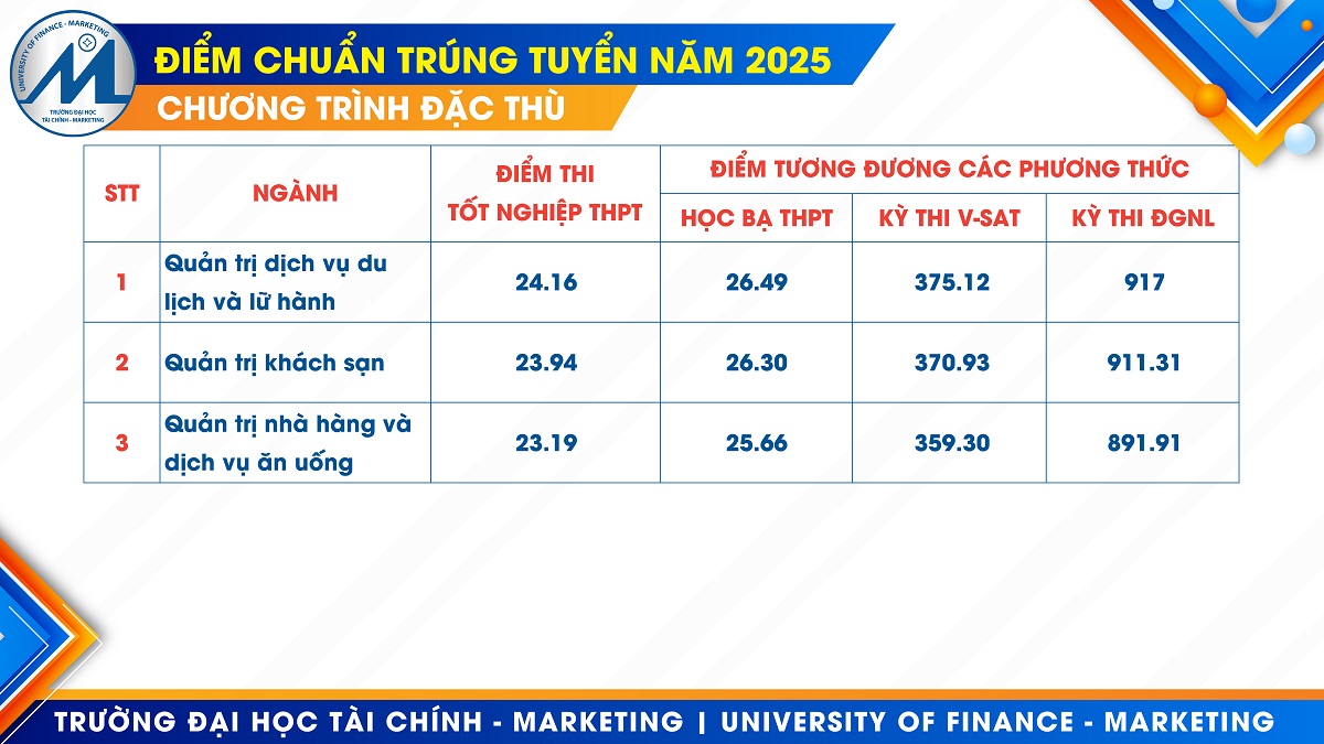 Tối ngày 22/8/2025, Trường Đại học Tài chính – Marketing (UFM) đã chính thức công bố điểm chuẩn trúng tuyển đợt 1 vào các ngành đào tạo đại học chính quy năm 2025. Việc công bố điểm chuẩn năm nay cho thấy sức hút mạnh mẽ của các ngành thuộc khối kinh tế, tài chính, marketing và kinh doanh quốc tế tại UFM, đồng thời khẳng định uy tín của Nhà trường trong công tác đào tạo nguồn nhân lực chất lượng cao cho xã hội.