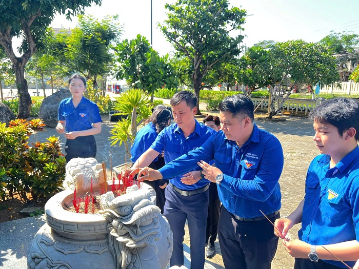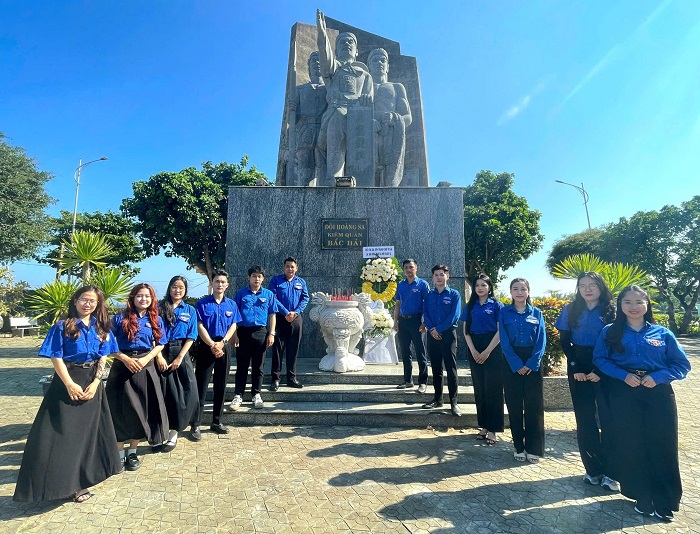 Đoàn công tác đồng chí Nguyễn Tiến Khôi – Bí thư Đoàn Trường Đại học Tài chính – Marketing và đồng chí Đào Mạnh Hùng – Bí thư Đoàn Trường Đại học Tài chính – Kế toán dẫn đầu dâng hương, dâng hoa tri ân các hùng binh Hải đội Hoàng Sa