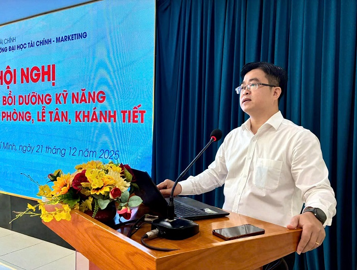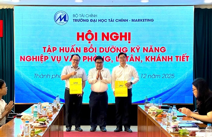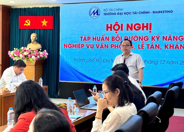 Sáng ngày 21/12/2025, tại cơ sở 27 Tân Mỹ, Trường Đại học Tài chính – Marketing (UFM) đã tổ chức thành công Hội nghị tập huấn bồi dưỡng kỹ năng, nghiệp vụ văn phòng, lễ tân và khánh tiết. Với sự hướng dẫn trực tiếp của các chuyên gia giàu kinh nghiệm thực tiễn, hội nghị là bước đi chiến lược trong lộ trình chuyên nghiệp hóa đội ngũ và hiện đại hóa quy trình hành chính của Nhà trường.
