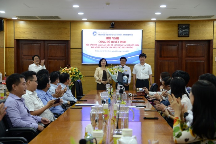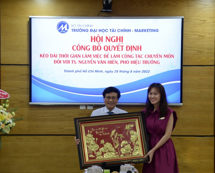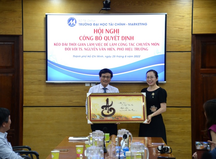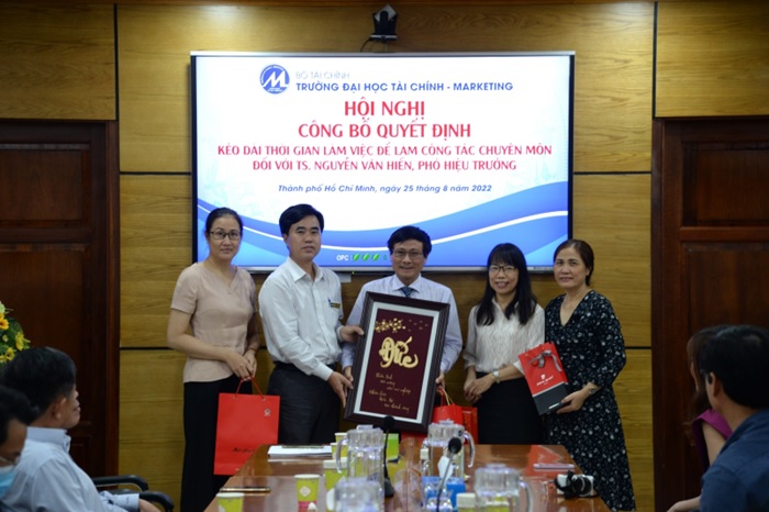 Tại Hội nghị, PGS. TS Hồ Thủy Tiên, Chủ tịch Hội đồng trường đã thay mặt tập thể Lãnh đạo Trường trao Nghị quyết của Hội đồng trường kéo dài thời gian làm việc để làm công tác chuyên môn đối với TS. Nguyễn Văn Hiến và ghi nhận những đóng góp của Thầy đã thực hiện trong suốt thời gian vừa qua ở nhiều cương vị khác nhau. Chủ tịch Hội đồng trường cũng nhấn mạnh, Thầy Nguyễn Văn Hiến đã có một quá trình công tác tại trường lâu dài, đã có nhiều cống hiến, đóng góp thiết thực, chung tay cùng tập thể cán bộ Nhà trường, xây dựng Trường Đại học Tài chính - Marketing từ những ngày đầu thành lập với quy mô còn nhỏ, đào tạo trình độ trung cấp; nay trở thành một trường đại học đa ngành với nhiều bậc đào tạo khác nhau. Các lĩnh vực về khoa học công nghệ, cơ sở vật chất… mà Thầy đã từng phụ trách, đã có những chuyển biến quan trọng nhằm nâng cao uy tín và vị thế của Nhà trường. PGS.TS Hồ Thủy Tiên hy vọng, với tâm huyết, trí tuệ; TS. Nguyễn Văn Hiến tuy không còn giữ chức vụ quản lý nhưng trong thời gian tới, tiếp tục với công tác chuyên môn giảng dạy tại khoa Marketing, sẽ tiếp tục cùng với tập thể lãnh đạo Khoa đoàn kết, đồng lòng, tiếp tục có thêm những đóng góp về học thuật hơn nữa để đưa Trường Đại học Tài chính - Marketing phát triển theo chiến lược, tầm nhìn đã vạch ra, góp phần đào tạo nguồn nhân lực chất lượng cho xã hội, doanh nghiệp.