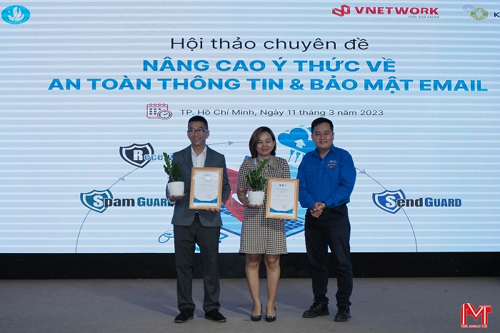 Tham gia buổi hội thảo các bạn đoàn viên, thanh niên và sinh viên được nghe chia sẻ tổng quan về tình trạng bảo mật và an toàn công nghệ thông tin; các thói quen sơ hở của người dùng mạng và các thủ thuật tấn công của hacker; đưa ra các phương pháp phòng vệ; Email - tầm quan trọng & các lưu ý trong quá trình sử dụng; biện pháp phòng vệ trước các cuộc tấn công có chủ đích qua Email đến từ ông Nguyễn Huy Dũng – Trưởng phòng Phát triển kinh doanh, bà Phan Thị Mỹ Hậu – Giám đốc điều hành Công ty Cổ phần VNETWORK.