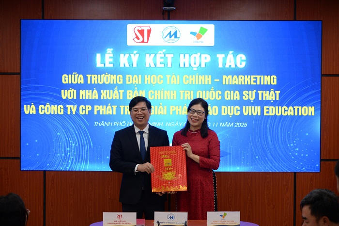 Sáng ngày 8/11/2025, tại Trường Đại học Tài chính – Marketing (UFM) đã diễn ra Lễ ký kết thỏa thuận hợp tác chiến lược giữa Nhà trường và Nhà xuất bản Chính trị Quốc gia Sự thật – đơn vị xuất bản hàng đầu trực thuộc Ban Tuyên giáo Trung ương và Công ty Cổ phần Phát triển Giải pháp giáo dục VIVI Education. Tham dự buổi lễ có đại diện lãnh đạo hai đơn vị cùng các phòng, khoa, trung tâm, giảng viên và sinh viên quan tâm đến công tác nghiên cứu, xuất bản và truyền thông học thuật.